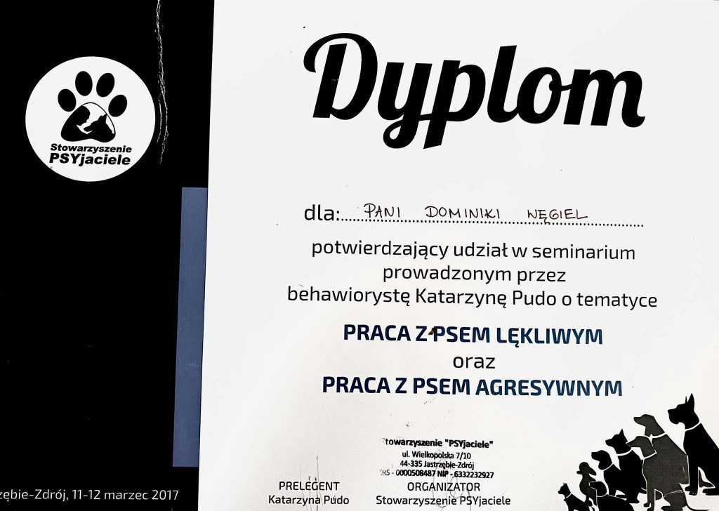 • Szkolenie ,,Praca z psem lękliwym oraz praca z psem agresywnym’’-prowadzony przez Katarzynę Pudo