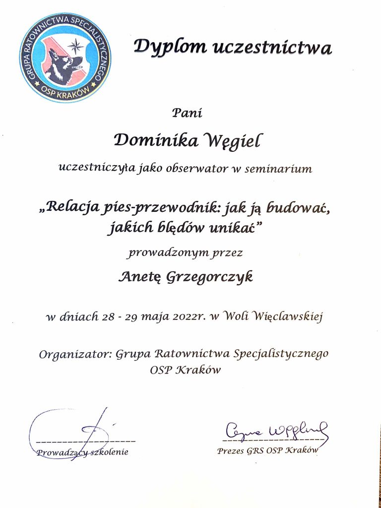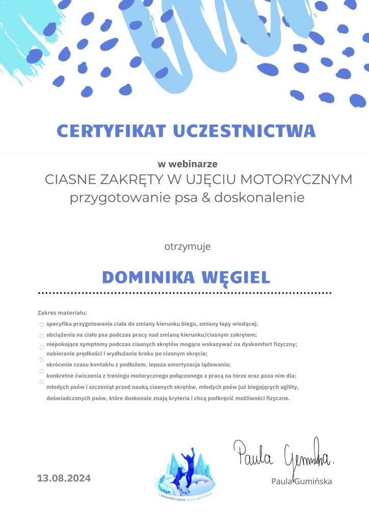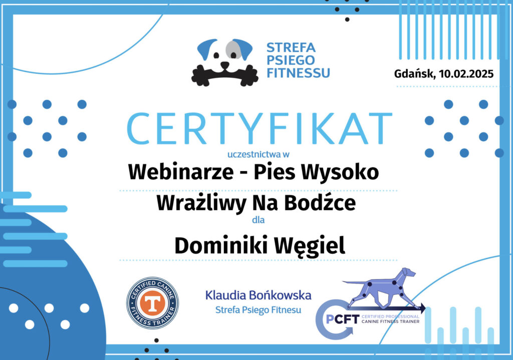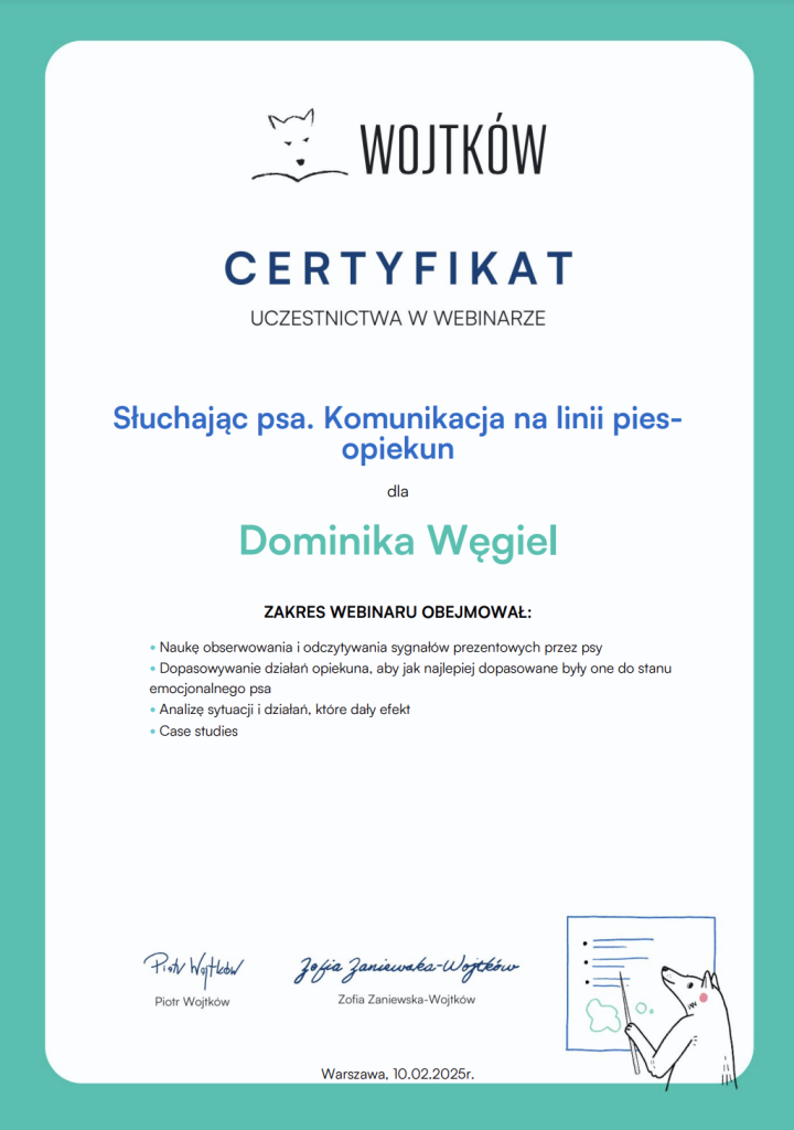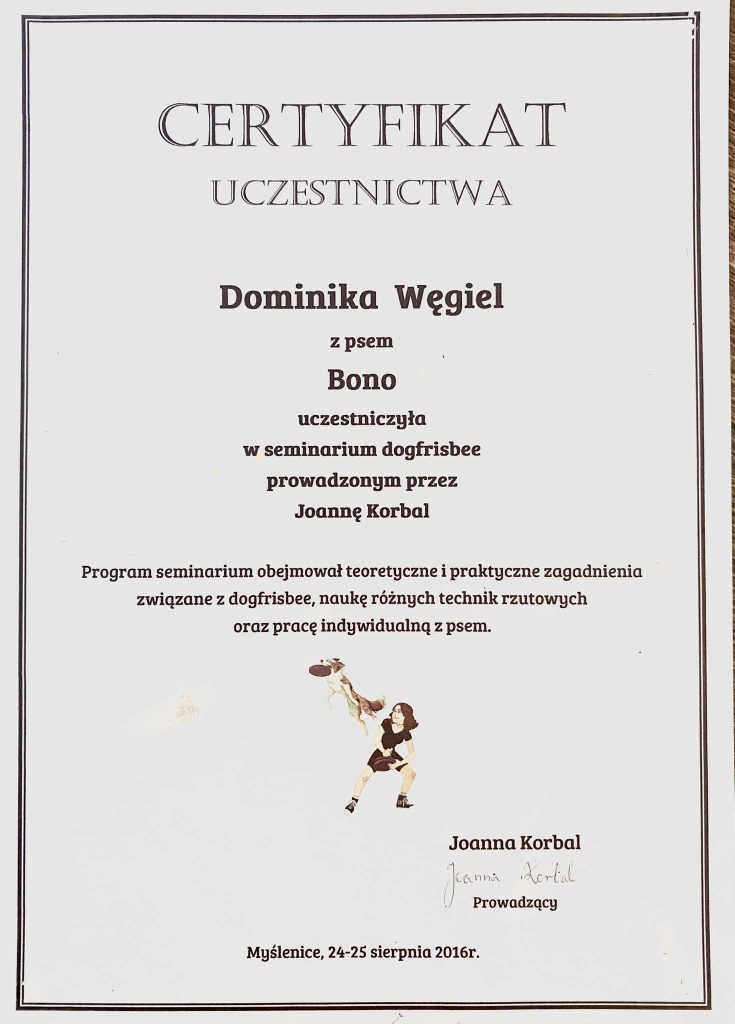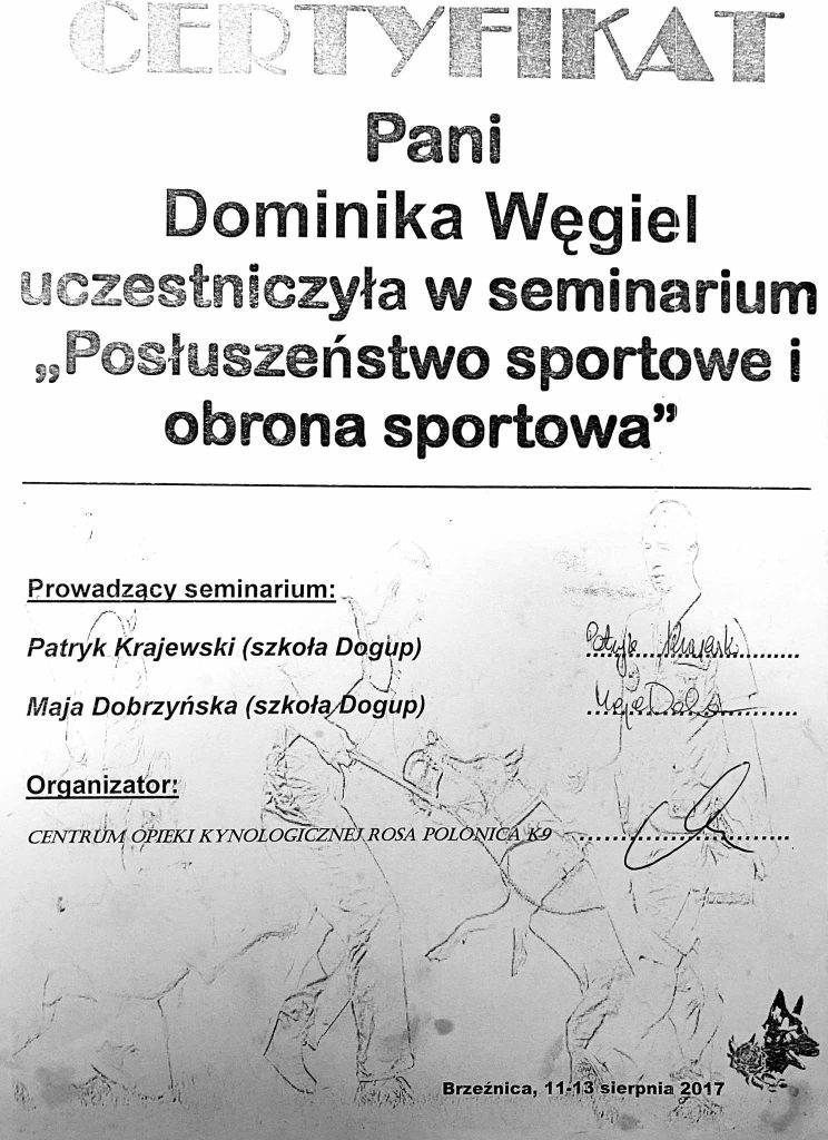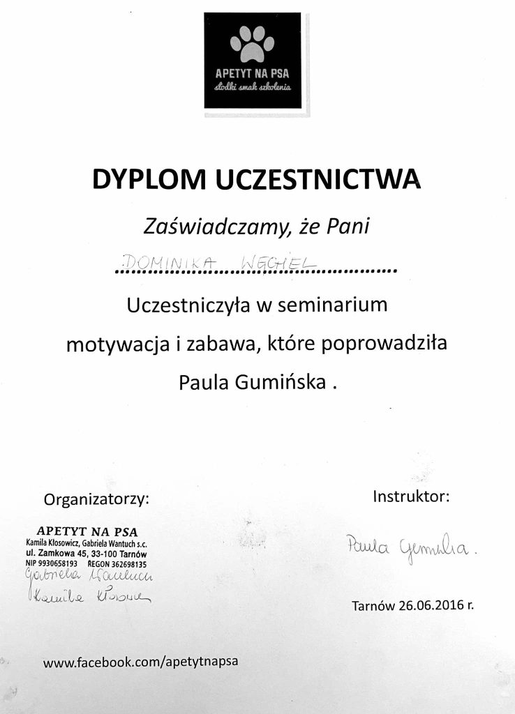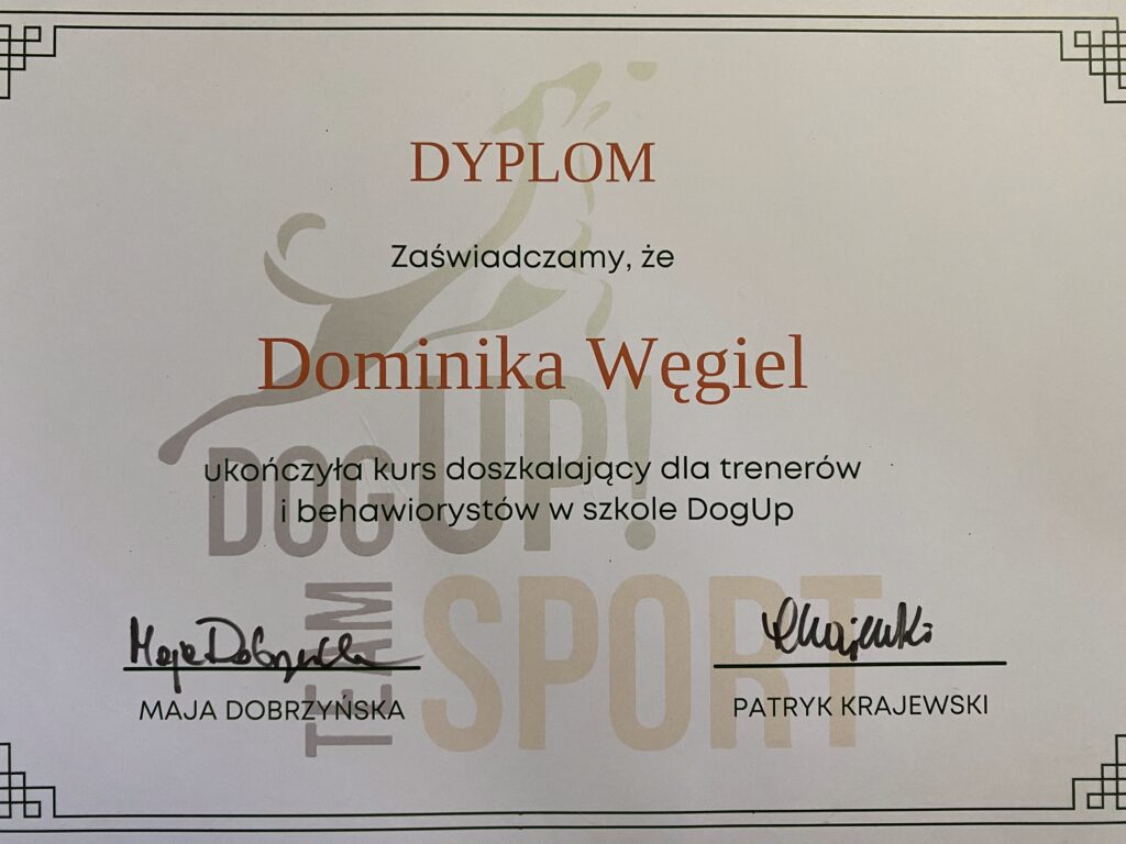 Na swoje pierwsze seminarium pojechałam w 2013 roku, od tego czasu nieustająco szukam ludzi od których mogę czerpać wartościową wiedzę. Łącznie odbyłam ponad 200 różnych szkoleń sportowych (obedience, nosework, detekcja, agility, dogfrisbee, psie zaprzęgi), behawioralnych, związanych z motoryką ruchu psów i fitnessem, a także wiele innych. Nieustająco się uczę i mam nadzieję, że nigdy nie przestanę.
