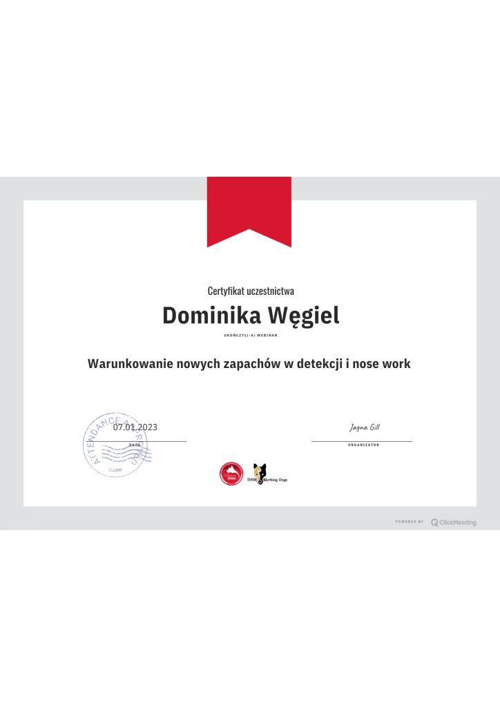 • Webinar ,,Planowanie treningów w detekcji zapachowej-Jagna Gill