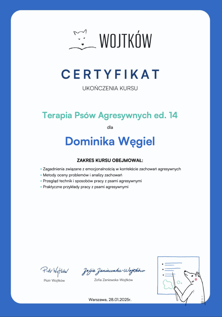 -Psia komunikacja:analiza warsztatów z psiej komunikacji oraz spacerów socjalizacyjnych, Praca nad kompetencjami społecznymi u psów. Trudne przypadki- Dobór odpowiedniego programu terapii.